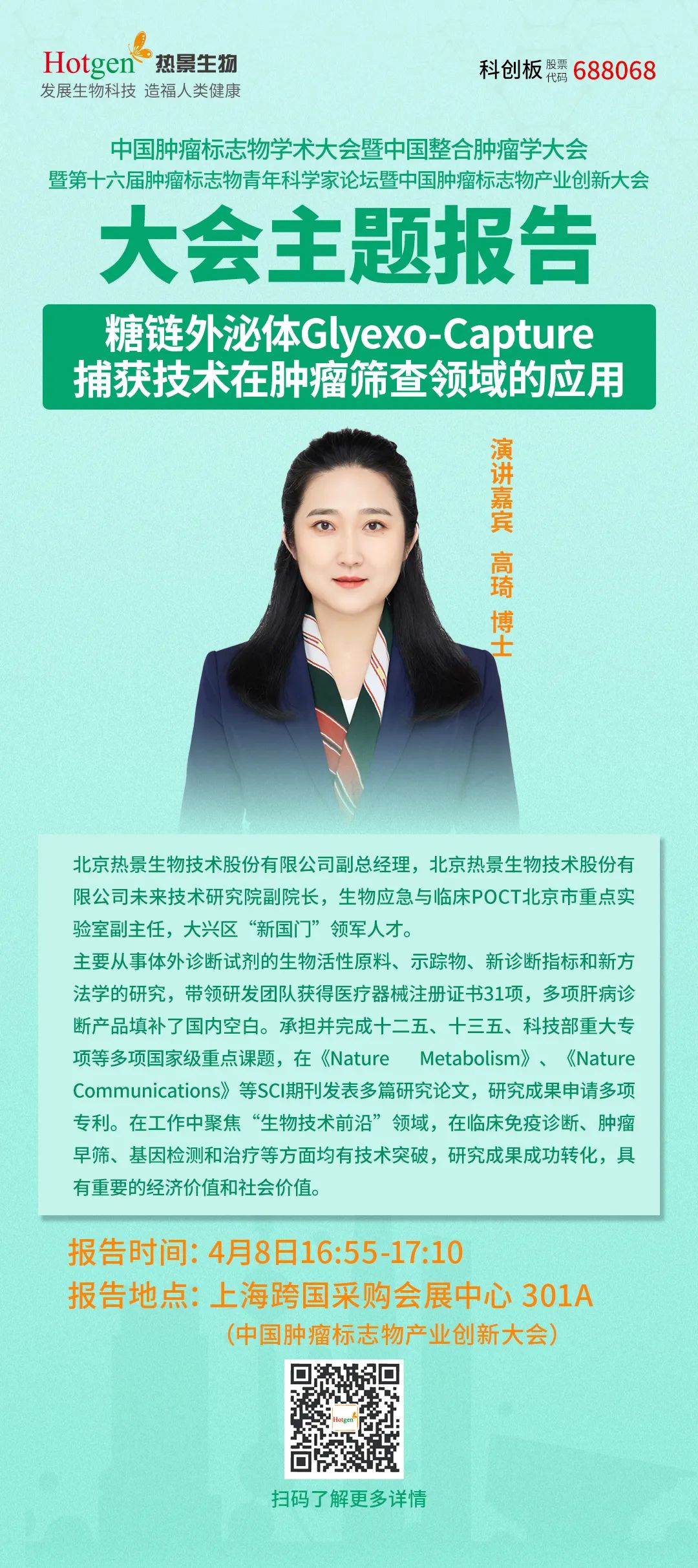 4月8日下午,北京熱景生物技術(shù)股份有限公司副總經(jīng)理,北京熱景生物未來技術(shù)研究院副院長高琦博士受邀在中國腫瘤標志物產(chǎn)業(yè)創(chuàng)新大會分享創(chuàng)新技術(shù)報告《糖鏈外泌體Glyexo-Capture捕獲技術(shù)在腫瘤篩查領域的應用》。