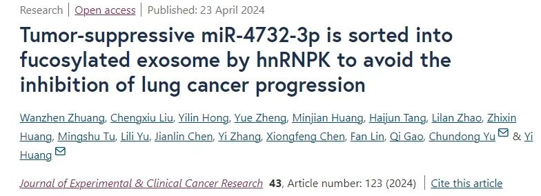 4月23日,福建醫(yī)科大學(xué)研究團(tuán)隊(duì)在期刊《Journal of Experimental & Clinical Cancer Research》上發(fā)表了題為“Tumor-suppressive miR-4732-3p is sorted into fucosylated exosome by hnRNPK to avoid the inhibition of lung cancer progression”的研究論文,本研究為非小細(xì)胞肺癌提供了一個(gè)有前景的生物標(biāo)志物,并通過靶向hnRNPK阻止miR-4732-3p從非小細(xì)胞肺癌細(xì)胞中“外泌體逃逸”,為非小細(xì)胞肺癌治療開辟了一條新的途徑。文章共同作者包括北京熱景生物技術(shù)股份有限公司高琦博士、劉城秀博士,熱景生物作為合作單位為研究的實(shí)施提供了重要支持。