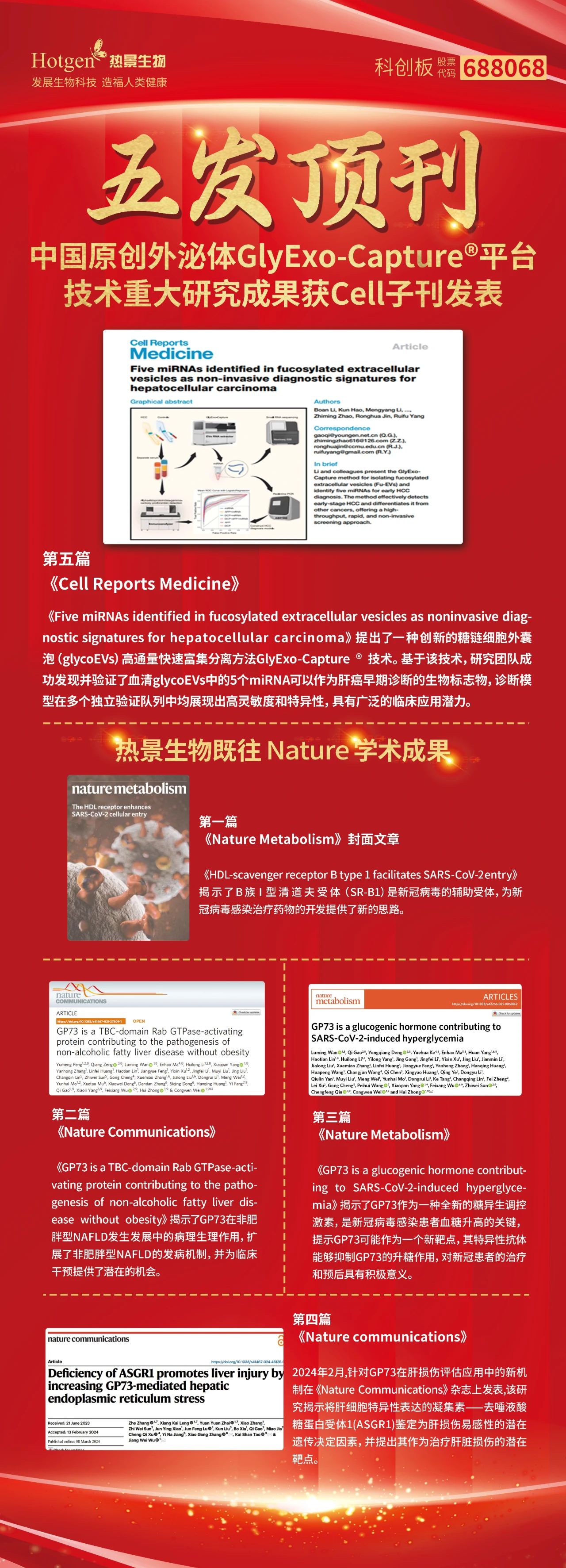 GIyExo-Capture?平臺是中國IVD科研創(chuàng)新創(chuàng)造的一個典范,針對全球范圍內(nèi)外泌體液體活檢應用準確率不高,操作繁瑣等臨床應用挑戰(zhàn),提供了創(chuàng)新的解決方案。該平臺采用糖捕獲技術,實現(xiàn)疾病相關外泌體全自動、快速高通量分離,以及外泌體運載microRNA的高靈敏度檢測。目前,熱景生物具有自主專利GIyExo-Capture?平臺開發(fā)的系列癌癥早期診斷成果陸續(xù)通過注冊檢驗(胰腺癌、肝癌、胃癌等),相關神經(jīng)退行性疾病研發(fā)項目進展順利。作為糖捕獲診斷方法學的提出者,熱景生物致力于將中國企業(yè)的原創(chuàng)性技術推廣應用到全球臨床,為全球患者帶來更精準、更便捷的診斷方案、使更多患者獲益于中國創(chuàng)新技術。