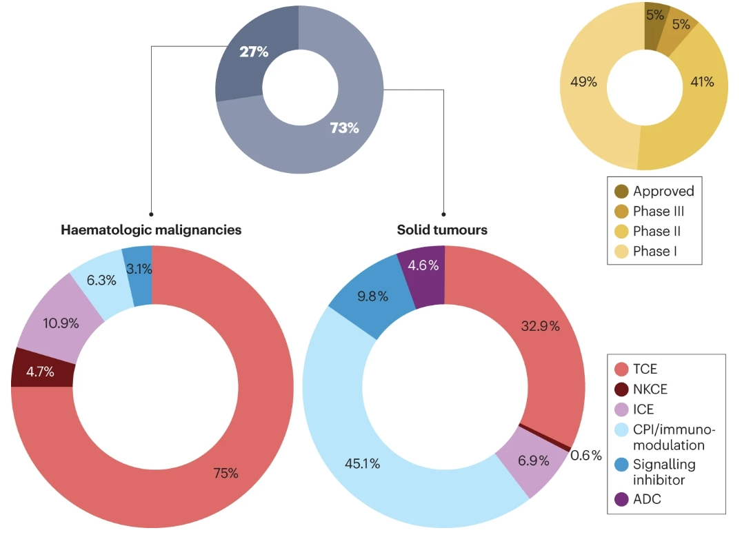 目前,有300多項(xiàng)臨床試驗(yàn)涉及200多種不同的雙特異性抗體分子,其中約75%用于治療實(shí)體瘤,25%用于治療血液系統(tǒng)惡性腫瘤。有10種bsAb藥物已被批準(zhǔn)用于癌癥治療,其中9種在美國(guó)和/或歐洲獲得批準(zhǔn),cadonilimab在中國(guó)獲得批準(zhǔn)。到目前為止,臨床中開(kāi)發(fā)的很大一部分bsAbs已經(jīng)處于后期階段(II期和III期)。另外,可以發(fā)現(xiàn),治療實(shí)體瘤的bsAbs主要由免疫調(diào)節(jié)劑主導(dǎo),包括雙CPI(約45%)和TCE(約33%),其次是靶向雙途徑、ICEs和ADC的bsAb。