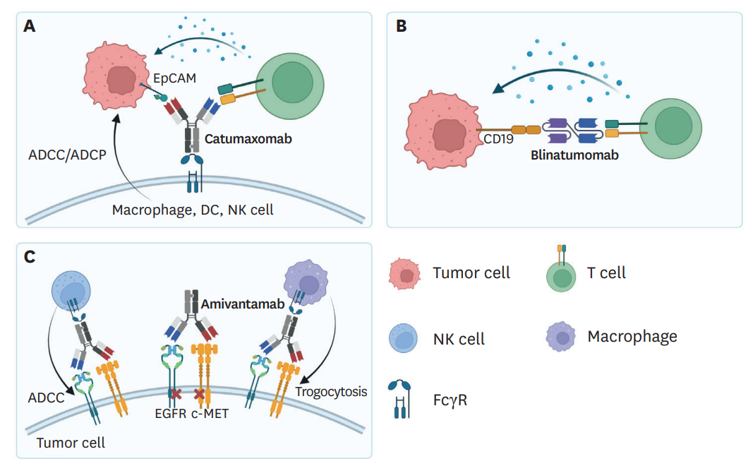癌癥免疫療法中使用的大多數(shù)bsAbs通過(guò)T細(xì)胞驅(qū)動(dòng)的天然或內(nèi)源性免疫發(fā)揮作用,包括免疫檢查點(diǎn)抑制(CPIs)效應(yīng)細(xì)胞接合器(包括TCE和ICEs)以及共刺激性bsAb。