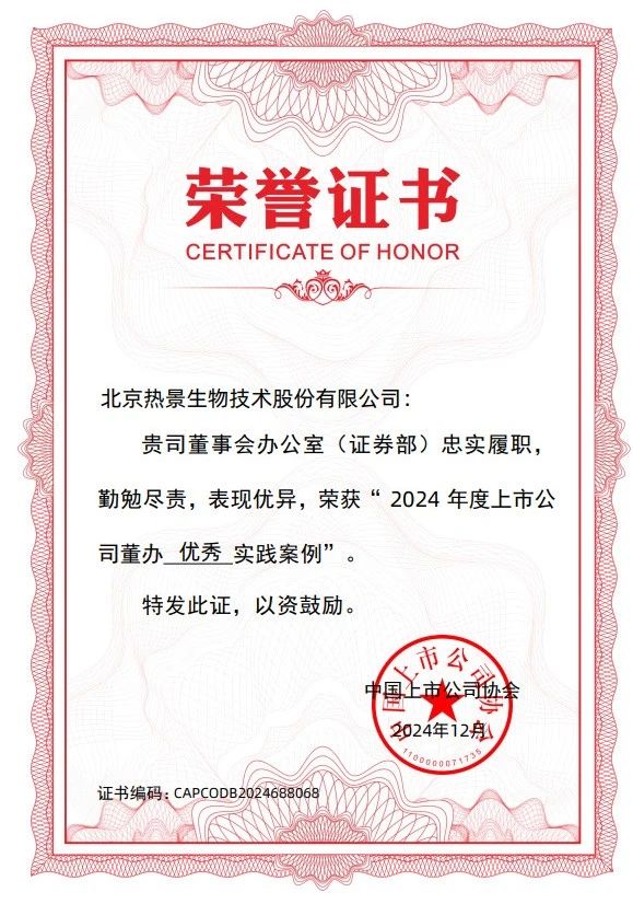 近日,中國(guó)上市公司協(xié)會(huì)開展的“上市公司董辦最佳實(shí)踐案例征集活動(dòng)”結(jié)果揭曉,熱景生物榮獲“2024年度上市公司董辦優(yōu)秀實(shí)踐案例”,這也是公司連續(xù)第三年獲此榮譽(yù)。 “上市公司董辦最佳實(shí)踐”案例征集活動(dòng)是中國(guó)上市公司協(xié)會(huì)對(duì)上市公司董事會(huì)辦公室履職情況進(jìn)行評(píng)價(jià),評(píng)價(jià)體系涵蓋了上市公司董辦工作所涉及的信息披露管理事務(wù)、公司治理機(jī)制建設(shè)、投資者關(guān)系管理事務(wù)等指標(biāo),于今年10月啟動(dòng),經(jīng)初審、專家委員會(huì)評(píng)審、誠(chéng)信核查等環(huán)節(jié),最終評(píng)出最佳實(shí)踐案例280家、優(yōu)秀實(shí)踐案例300家。其中入選“董辦優(yōu)秀實(shí)踐案例”的300家上市公司中,滬市上市公司150家,占50%;深市上市公司146家,占48.7%;北交所上市公司4家。