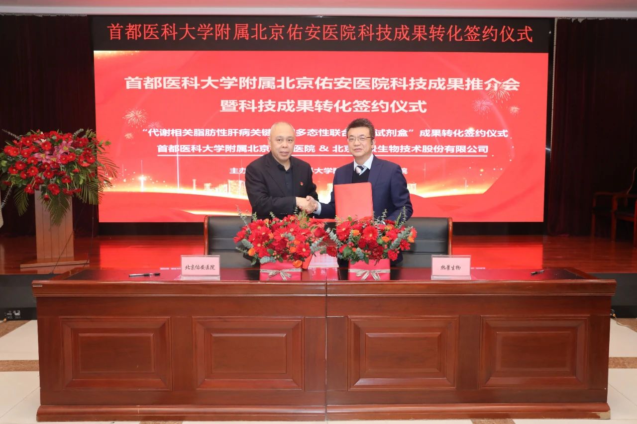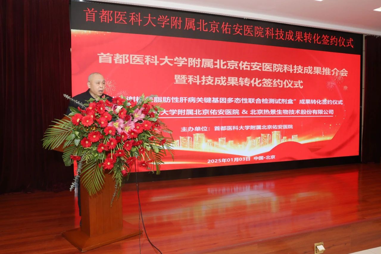 北京佑安醫(yī)院馬迎民院長在開幕致辭中指出,科技成果轉化是科技創(chuàng)新活動的重要組成部分,它不僅是科研成果從實驗室走向市場的關鍵環(huán)節(jié),也是推動醫(yī)學科技發(fā)展的重要力量。他首先回顧了2024年我院科技成果轉化工作取得的驕人成績,并對我院與熱景生物簽訂轉化協(xié)議表示祝賀。他指出,此次與熱景生物的簽約開啟了雙方合作共贏的新篇章,共同推動相關疾病早期診斷技術突破創(chuàng)新。他也希望借助此次成果推介機會,搭建起我院與大興區(qū)生物醫(yī)藥企業(yè)的溝通橋梁,拓展醫(yī)企合作渠道,推動醫(yī)療技術高質量發(fā)展,并通過資源共享和優(yōu)勢互補,促進創(chuàng)新成果轉移轉化。
